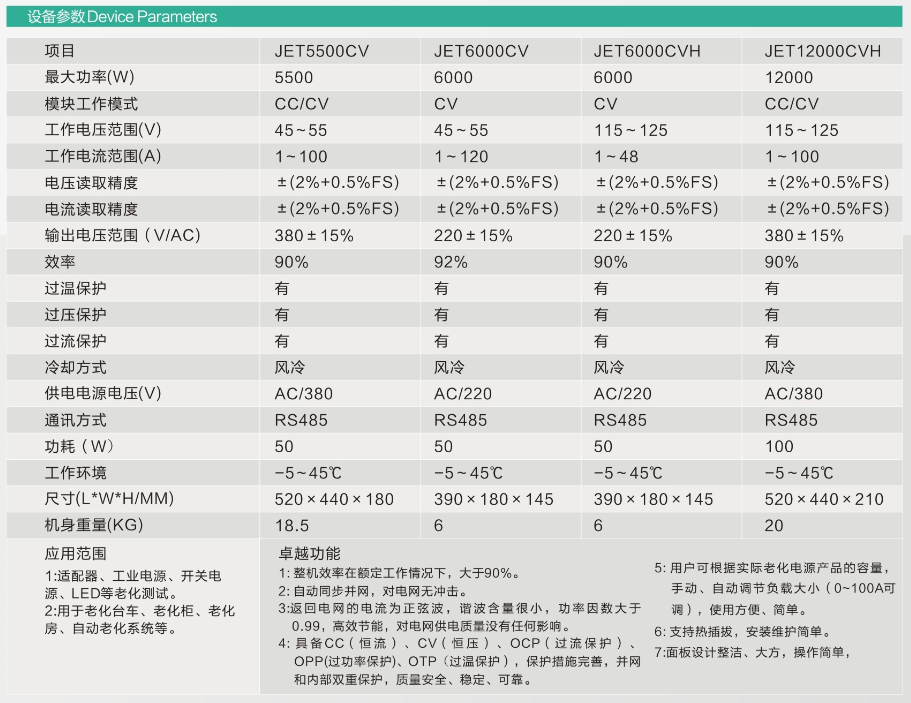 4: 具备CC(恒流)、CV(恒压)、OCP(过流保护)、OPP(过功率保护)、OTP(过温保护),保护措施完善,并网和内部双重保护,质量安全、稳定、可靠;